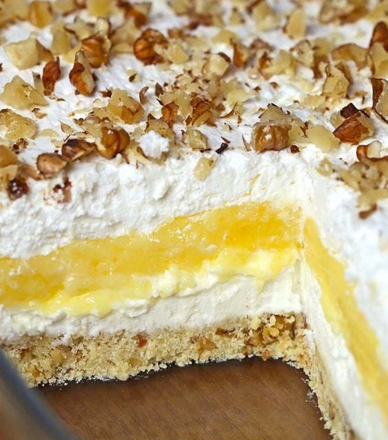 9. Layer 4: Spread remaining cool whip over the top, and sprinkle with remaining walnuts/pecans.
