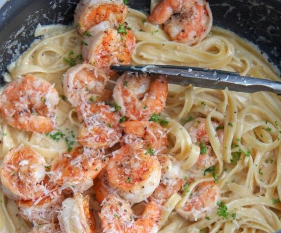 _Place the pasta during a dish, top the shrimp, and serve hot