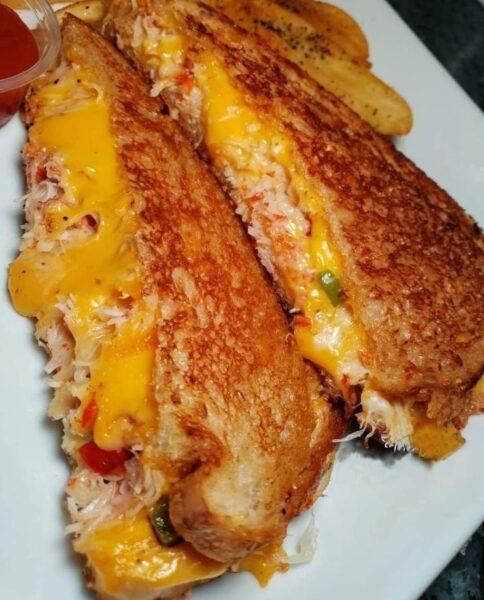 Layer 2 cheese slices over 2 slices of bread. Top each sandwich evenly with the crabmeat mixture and then 2 additional slices of cheese. Spread butter on one side of each sandwich.