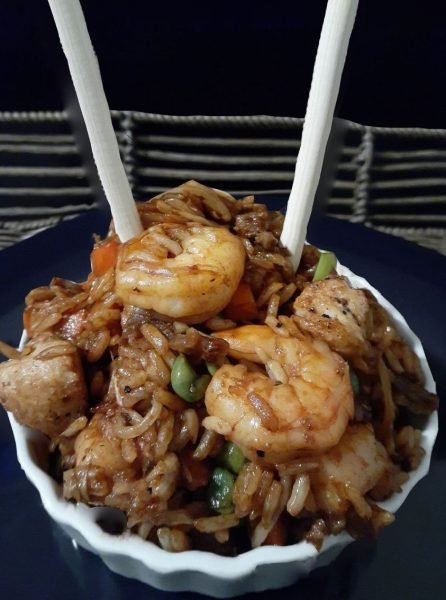 slowly stir to incorporate all ingredients with rubber spatula add your chicken and steak continue to stir another minute or two and you’re ready to eat.