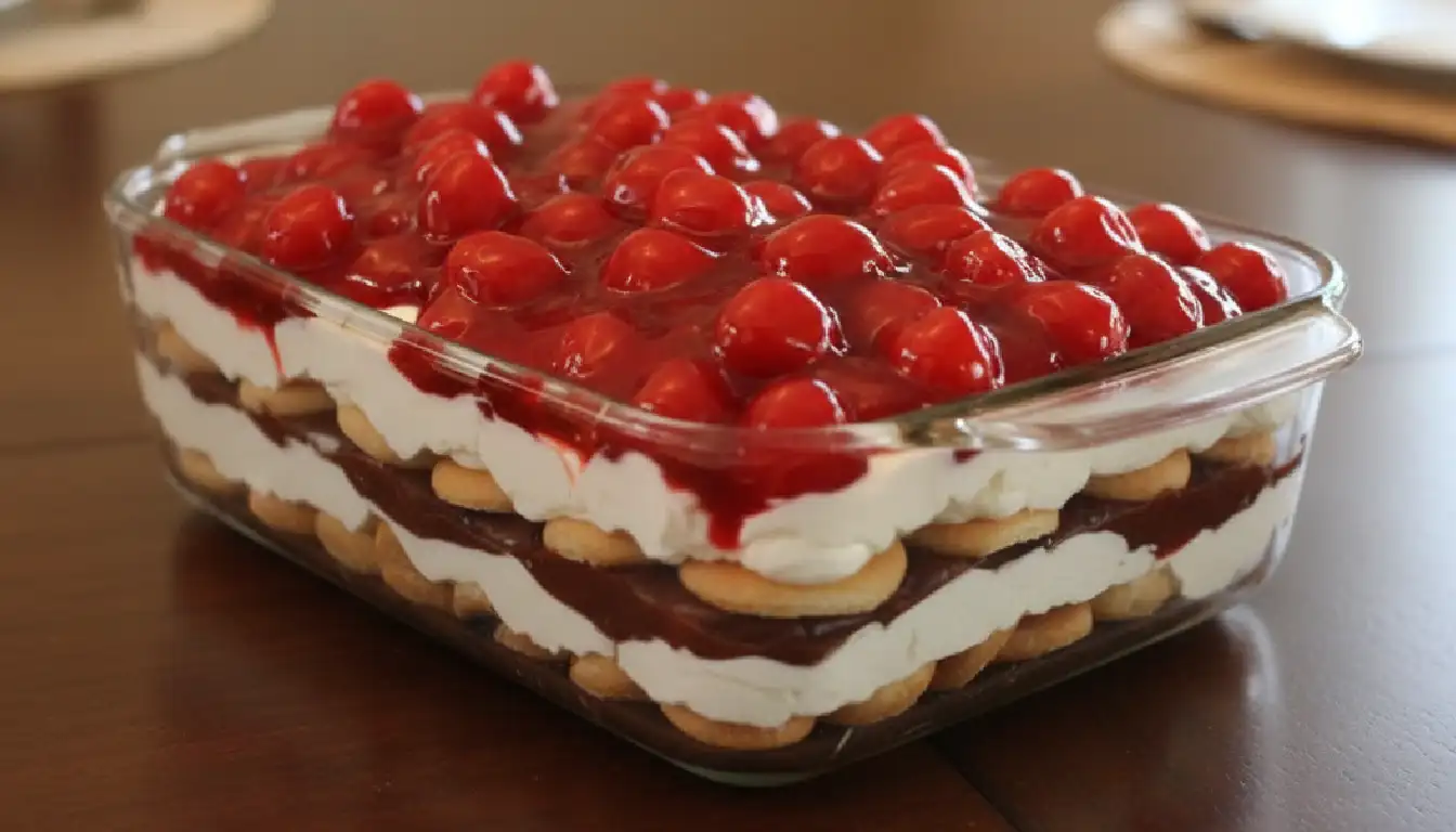 There is something undeniably nostalgic about a layered dessert that requires nothing more than a few bowls and a little patience in the fridge. This No-Bake Cherry Cheesecake Cookie Lasagna is the kind of dish that stops the room when you set it on the table. It starts with the buttery, golden crunch of Nilla Wafers, which eventually soften into a cake-like texture, cradling a velvet-smooth cream cheese filling. The real magic, however, lies in the double hit of cherry—a bright, tart layer of preserves tucked inside and a glossy, indulgent crown of cherry pie filling on top. It is cool, creamy, and carries that perfect balance of sweetness and tang that makes you reach for “just one more sliver.”