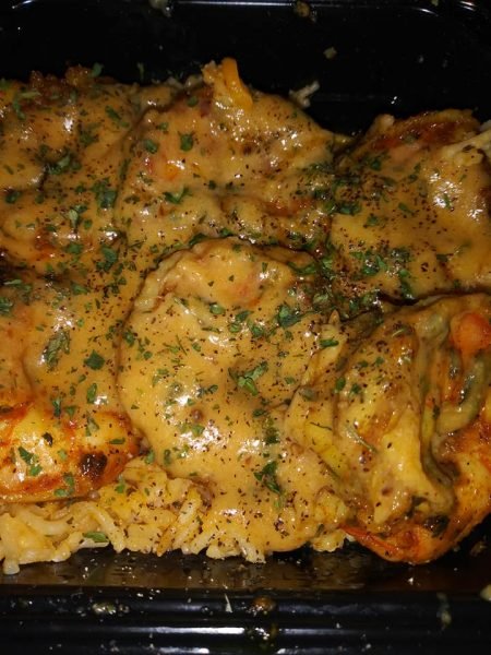 Prawns, chicken cheesy rice with home made garlic butter sauce