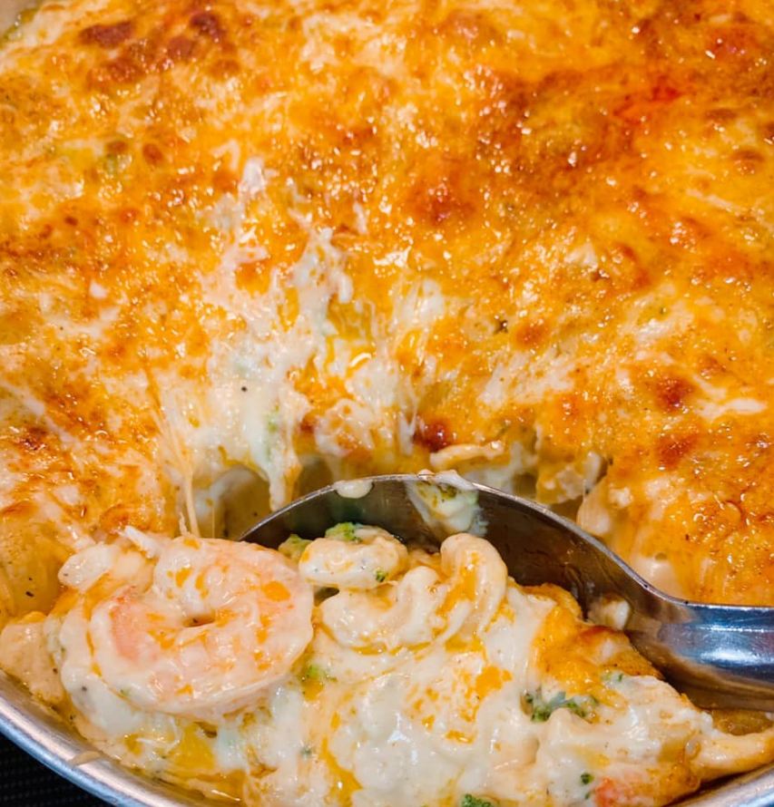 Line a baking dish with nonstick cooking spray. Then add half of macaroni mixture. Next take half the shrimp and crab and lay on top of macaroni. Lightly press shrimp and crab into. Macaroni.