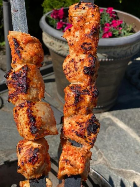 I don’t have exact measurements but I put a tomato, medium sized onion, 5 cloves of garlic, a heaping spoonful of tomato paste and olive oil all into a food processor and blended it. I then added salt, pepper, cumin and oregano all to taste and blended it some more. The consistency should be a little thicker, not too watery. I cubed up chicken breast and sirloin (I think lamb is best for this though) and I tossed it in the marinade and let it sit for about 6 hours. If I can I let it sit overnight, but even after a couple hours the beef should still be nice and tender. Then skewer it and cook it over coals or on a grill.