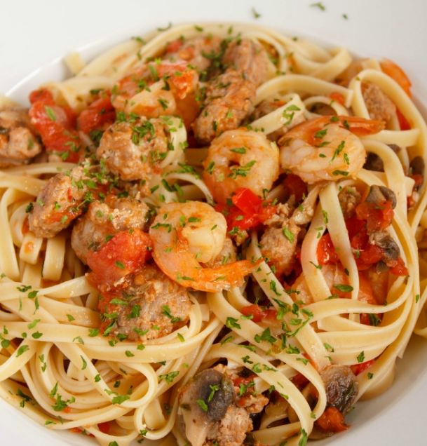 When the colour is nice and light amber but still has some time left to cook, add sausage, onion, salt, and pepper. Cook until sausage is just browned, about 5 minutes. Stir in garlic and cook for a minute or aromatic. Stir in pepper, parsley, tomatoes, salt, and pepper. Bring to a boil and reduce heat to a simmer. Simmer for 15 minutes, or until sausage is cooked through. Add in frozen shrimp and cook for 5 more minutes or until heated through.