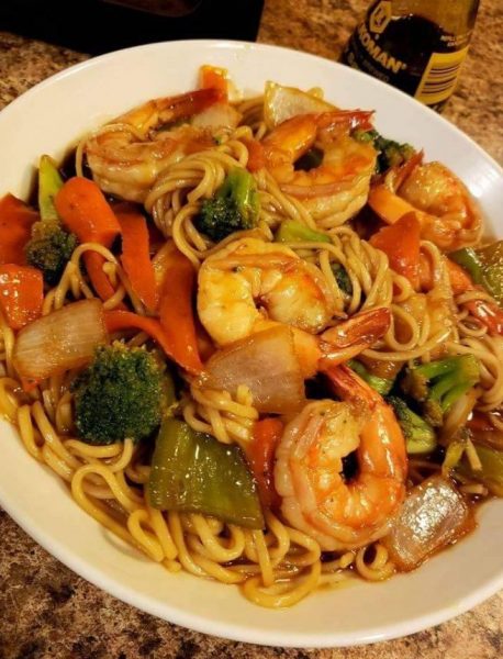 Add shrimp and broccoli…cook another 3 to 4 minutes then add sauce and brown sugar, stir, cook 2 minutes. Add noodles and toss until well coated. Serve hot!