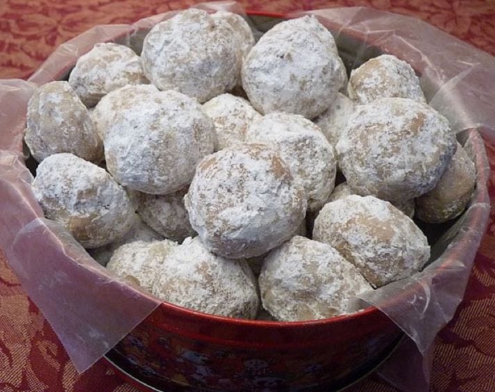 4. While still warm, roll cookies in powdered sugar. When cookies have cooled, roll them again in the confectioners sugar to give them a nice even coating of sugar. Store in an airtight container.
